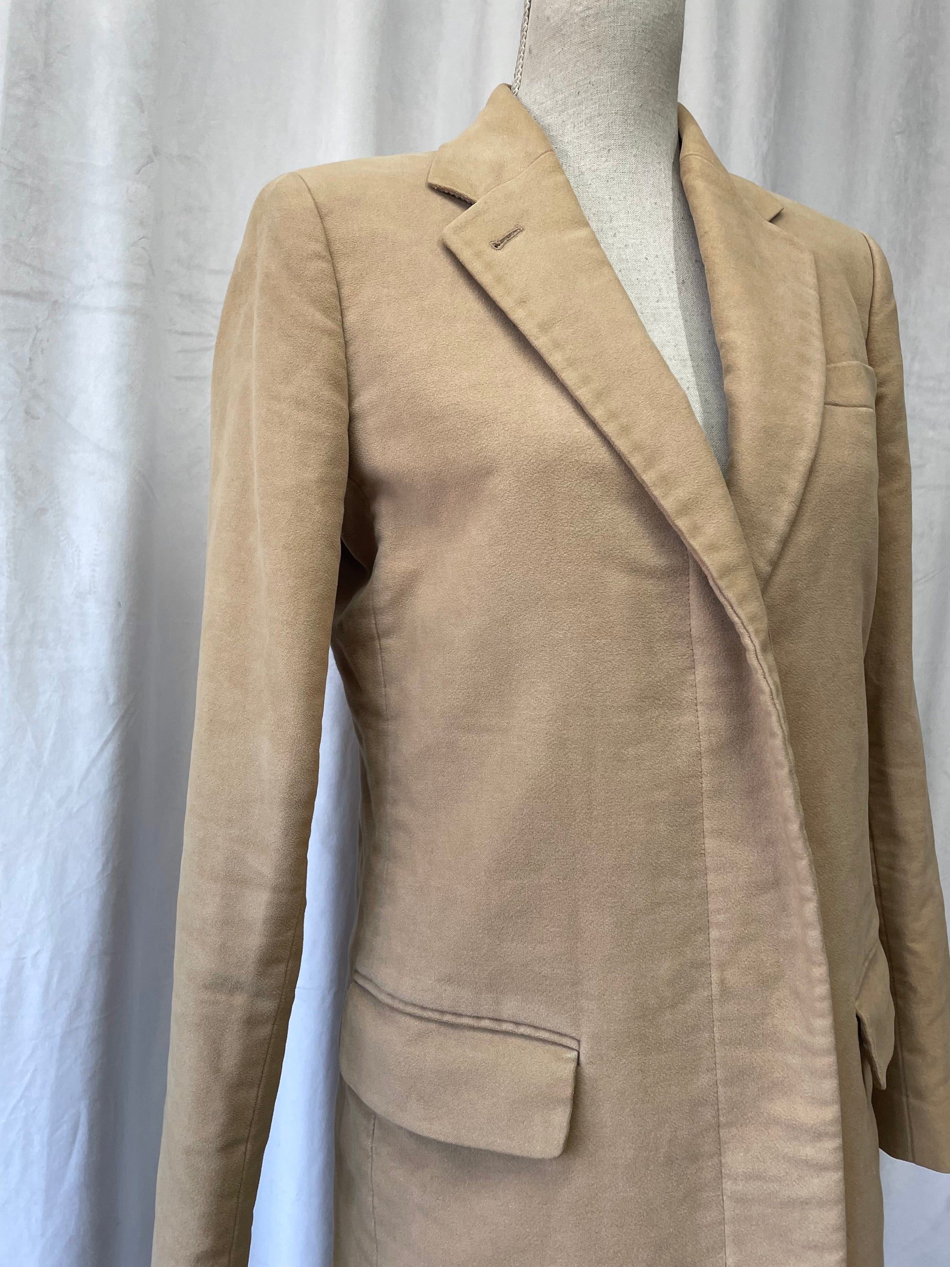 Moleskine/brushed cotton with viscose lining. Size L ca. Heavy discoloration on one shoulder.